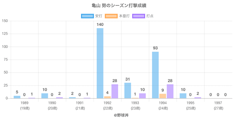亀山 努 (56歳)は1989年から1997年にかけて活躍した元阪神所属のプロ野球選手です。 投打は右投左打で、守備位置は主に外野手ができ、日本球界初出場は1989年で当時20歳でした。 同年代には中山(元千葉ロッテ)や島田(元大阪近鉄)がいます。 過去には1992年阪神で全131試合出場ヒット140本や1994年阪神で全105試合出場ヒット93本という結果を残しています。