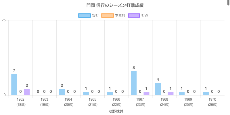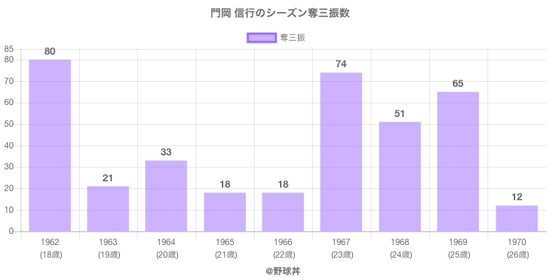 門岡 信行 (82歳)は1962年から1970年にかけて活躍した元中日所属のプロ野球選手です。 投打は右投右打で、守備位置は主に投手、日本球界初出場は1962年で当時19歳でした。 同年代には渡辺(元大洋)安田(元東京)がいます。 過去には1962年中日で全53試合出場80奪三振や1967年中日で全30試合出場74奪三振という結果を残しています。