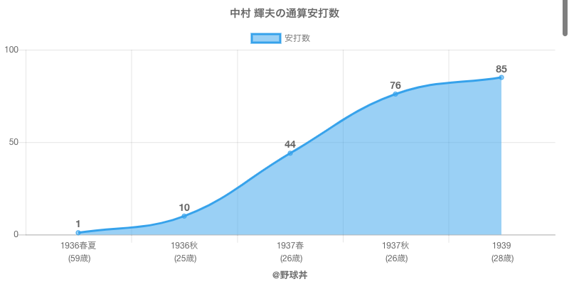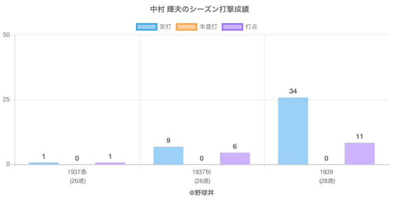 中村 輝夫は1936春夏年から1939年にかけて活躍した元金鯱所属のプロ野球選手です。 投打は右投左打で、守備位置は主にができ、日本球界初出場は1936春夏年で当時26歳でした。 同年代には塩田(元セネタース)小島(元名古屋)がいます。 過去には1937春年金鯱で全53試合出場ヒット34本や1937秋年金鯱で全49試合出場ヒット32本という結果を残しています。
