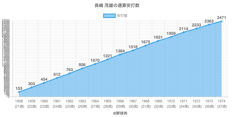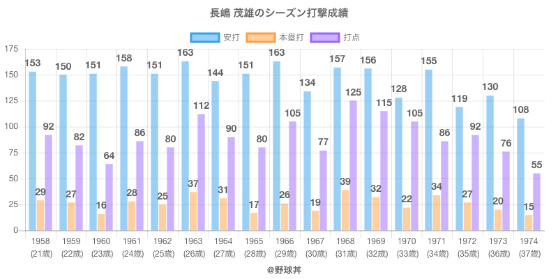 長嶋 茂雄 (89歳)は1958年から1974年にかけて活躍した元読売所属のプロ野球選手です。 投打は右投右打で、守備位置は主に三塁手ができ、日本球界初出場は1958年で当時22歳でした。 同年代には興津(元広島東洋)やフランク(元太平洋)がいます。 過去には1962年読売で全134試合出場ヒット151本や1963年読売で全134試合出場ヒット163本という結果を残しています。 また19度主要タイトルを獲得しています。(最優秀新人1回 / 最多本塁打2回 / 最多打点5回 / 首位打者6回 / 最優秀選手5回)