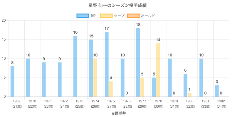 星野 仙一 (78歳)は1969年から1982年にかけて活躍した元中日所属のプロ野球選手です。 投打は右投右打で、守備位置は主に投手、日本球界初出場は1969年で当時22歳でした。 同年代には牧(元阪急)得津(元ロッテ)がいます。 過去には1969年中日で全49試合出場99奪三振や1974年中日で全49試合出場15勝という結果を残しています。 また1度主要タイトルを獲得しています。(最高勝率1回)