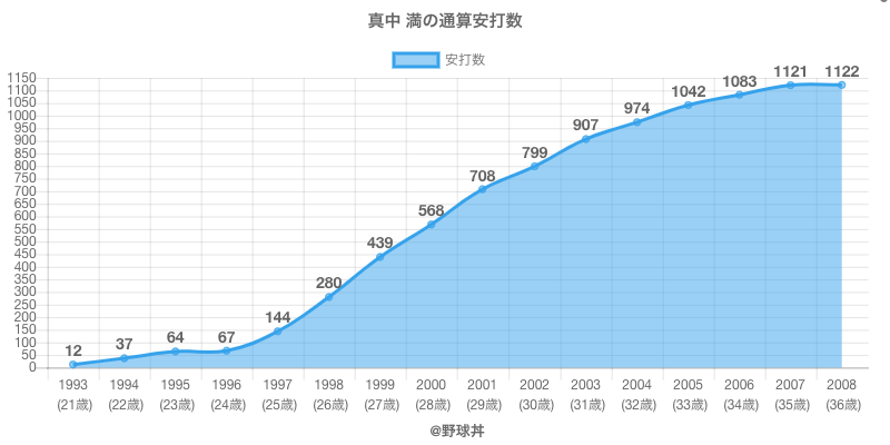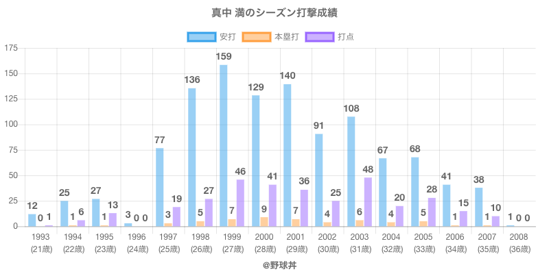 真中 満 (54歳)は1993年から2008年にかけて活躍した元ヤクルトや東京ヤクルト所属のプロ野球選手です。 投打は左投左打で、守備位置は主に外野手ができ、日本球界初出場は1993年で当時22歳でした。 同年代には野口(元横浜)シェーン(元横浜)がいます。 過去には1998年ヤクルトで全133試合出場ヒット136本や1999年ヤクルトで全133試合出場ヒット159本という結果を残しています。