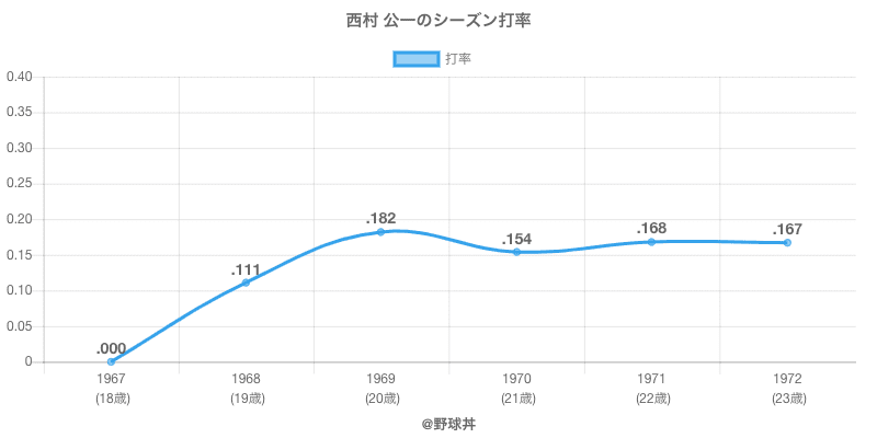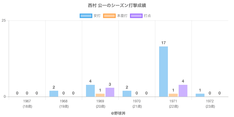 西村 公一 (77歳)は1967年から1972年にかけて活躍した元阪神所属のプロ野球選手です。 投打は右投右打で、守備位置は主に三塁手・一塁手・外野手ができ、日本球界初出場は1967年で当時19歳でした。 同年代には加藤(元南海)高垣(元クラウン)がいます。 過去には1971年阪神で全52試合出場ヒット17本や1969年阪神で全23試合出場ヒット4本という結果を残しています。
