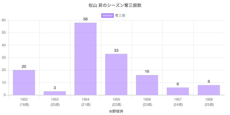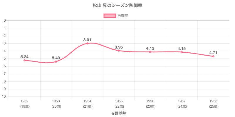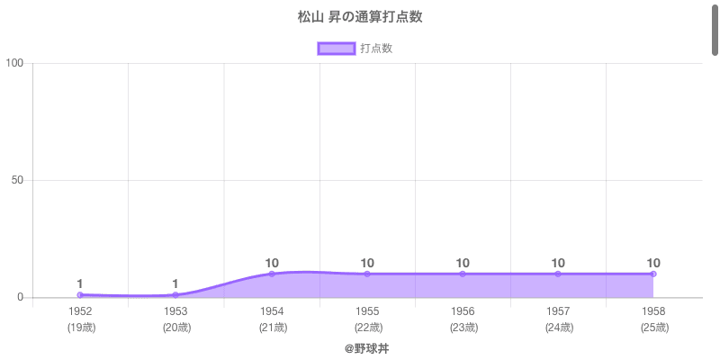松山 昇 (93歳)は1952年から1958年にかけて活躍した元広島所属のプロ野球選手です。 投打は右投右打で、守備位置は主に投手、日本球界初出場は1952年で当時20歳でした。 同年代には木村(元中日)チコ(元近鉄)がいます。 過去には1954年広島で全39試合出場18勝や1955年広島で全31試合出場10勝という結果を残しています。
