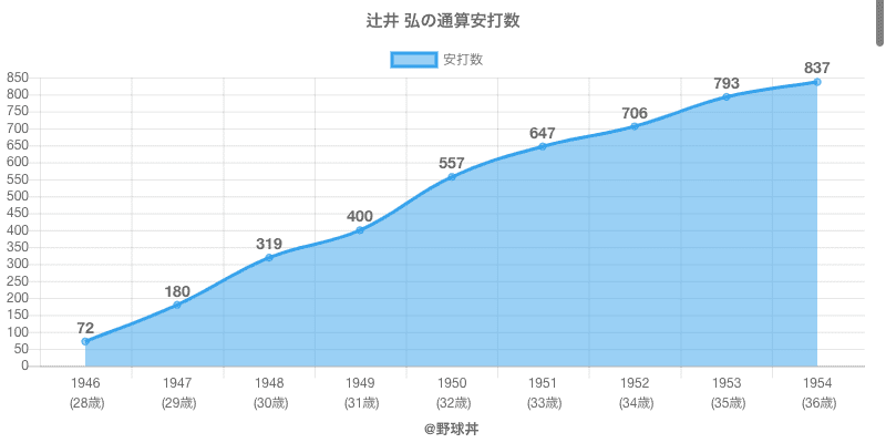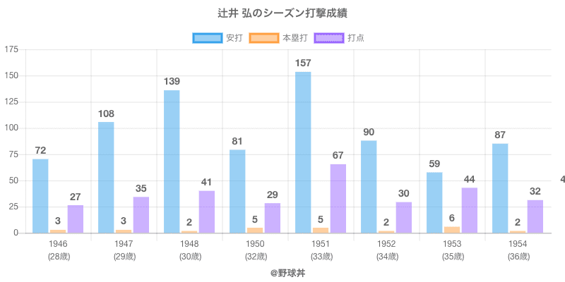辻井 弘は1946年から1954年にかけて活躍した元太陽や大陽所属のプロ野球選手です。 投打は右投左打で、守備位置は主にができ、日本球界初出場は1946年で当時29歳でした。 同年代には富松(元パシフィック)伊賀上(元大映)がいます。 過去には1950年広島で全138試合出場ヒット157本や1948年大陽で全125試合出場ヒット139本という結果を残しています。