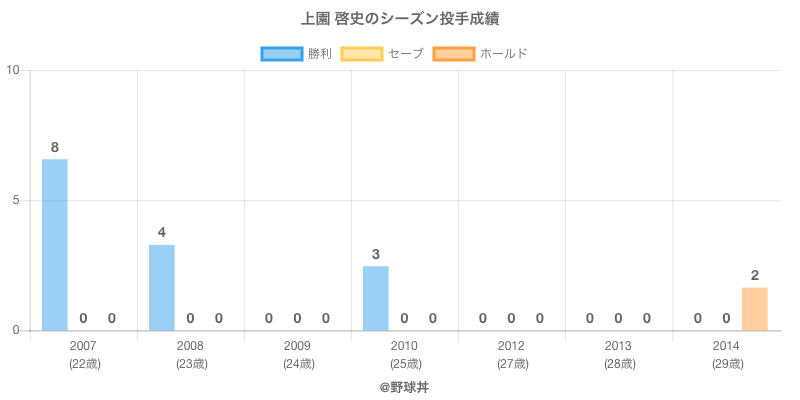 上園 啓史 (41歳)は2007年から2014年にかけて活躍した元東北楽天や阪神所属のプロ野球選手です。 投打は右投右打で、守備位置は主に投手、日本球界初出場は2007年で当時23歳でした。 同年代にはヘスス(元広島東洋)嶋(楽天)がいます。 過去には2010年阪神で全25試合出場39奪三振や2007年阪神で全17試合出場防御率2.42という結果を残しています。 また1度主要タイトルを獲得しています。(最優秀新人1回)