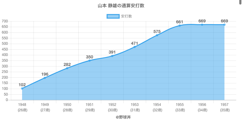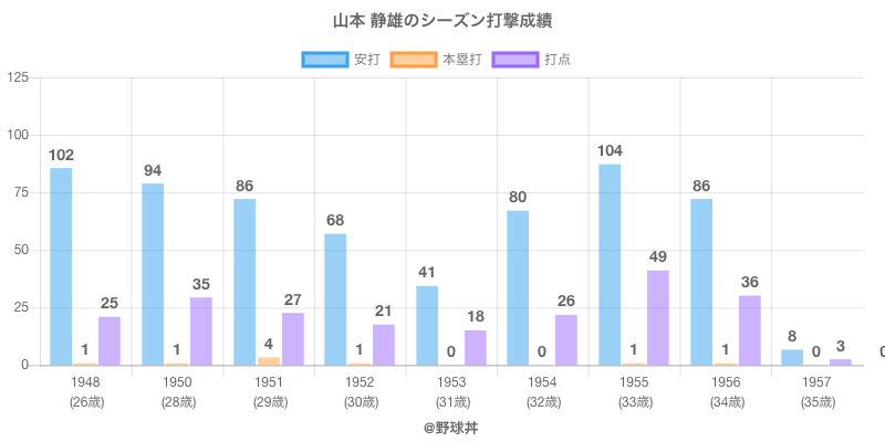 山本 静雄は1948年から1957年にかけて活躍した元近鉄や中日所属のプロ野球選手です。 投打は右投左打で、守備位置は主に二塁手ができ、日本球界初出場は1948年で当時27歳でした。 同年代には増田(元大映)野口(元阪神)がいます。 過去には1954年近鉄で全134試合出場ヒット104本や1949年中日で全130試合出場ヒット94本という結果を残しています。