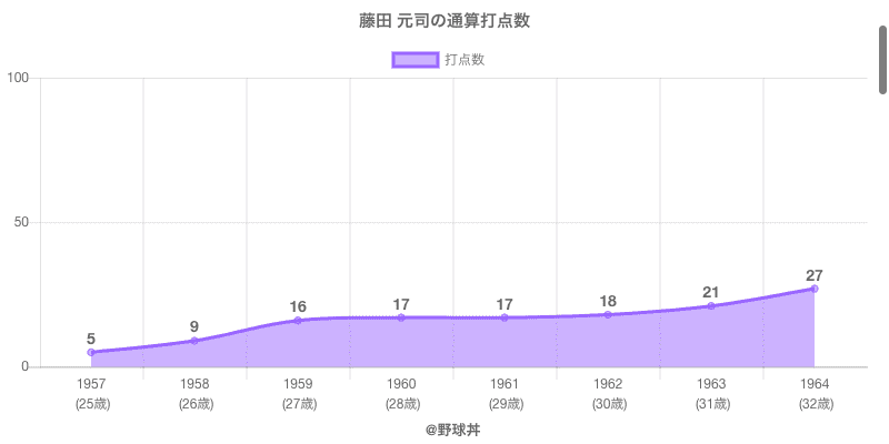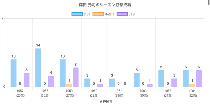 | 1957 | 読売ジャイアンツ | 60 | 77 | .130 | 10 | 0 | 5 |