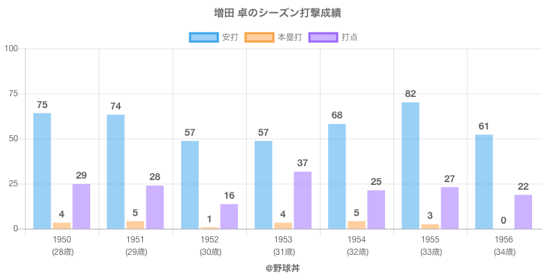 増田 卓は1950年から1956年にかけて活躍した元大映所属のプロ野球選手です。 投打は右投右打で、守備位置は主にができ、日本球界初出場は1950年で当時29歳でした。 同年代には渡辺(元大洋)荒木(元近畿日本)がいます。 過去には1954年大映で全119試合出場ヒット68本や1955年大映で全116試合出場ヒット82本という結果を残しています。