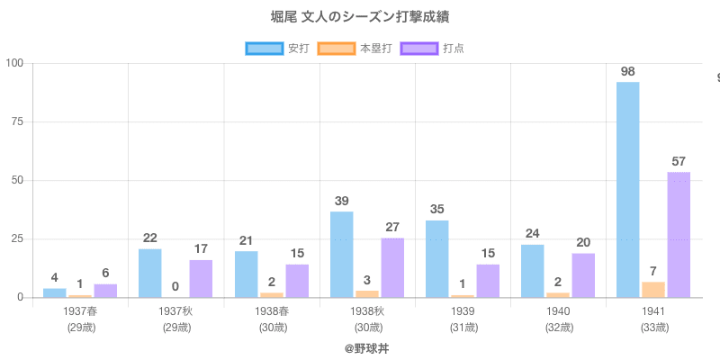 | 1937春 | 28 | 86 | .244 | 21 | 2 | 15 | |