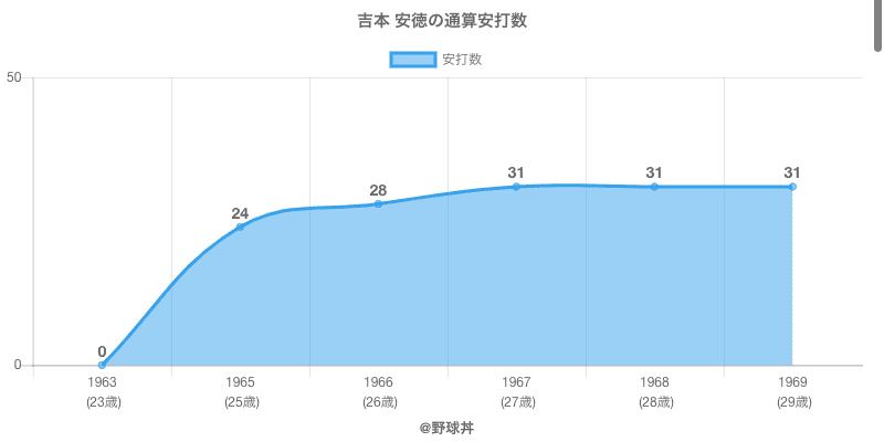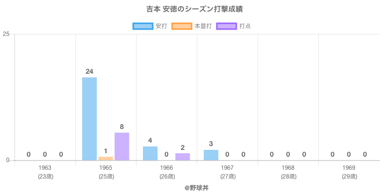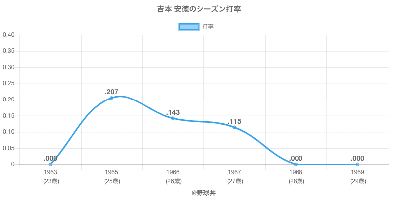 吉本 安徳 (86歳)は1963年から1969年にかけて活躍した元阪急所属のプロ野球選手です。 投打は右投右打で、守備位置は主にができ、日本球界初出場は1963年で当時24歳でした。 同年代には安藤(元阪神)渋谷(元アトムズ)がいます。 過去には1965年阪急で全94試合出場ヒット24本や1967年阪急で全60試合出場ヒット3本という結果を残しています。
