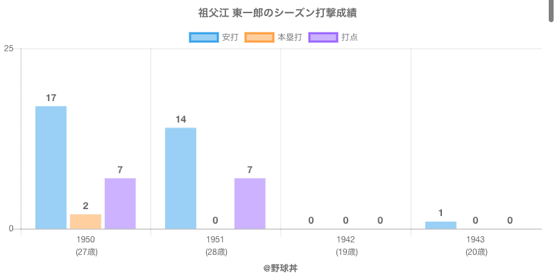祖父江 東一郎は1942年から1951年にかけて活躍した元大洋や西鉄所属のプロ野球選手です。 投打は右投右打で、守備位置は主に投手、日本球界初出場は1942年で当時20歳でした。 同年代には金山(元広島)衛藤(元中日)がいます。