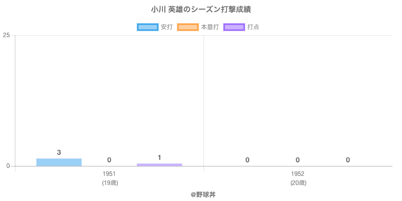 おがわ ひでお 小川 英雄 小川 英雄 (94歳)は1951年から1952年にかけて活躍した元阪急所属のプロ野球選手です。 投打は右投右打で、守備位置は主にができ、日本球界初出場は1951年で当時20歳でした。 同年代には岡田(元阪神)や広岡(元読売)がいます。 過去には1951年阪急で全8試合出場ヒット3本という結果を残しています。