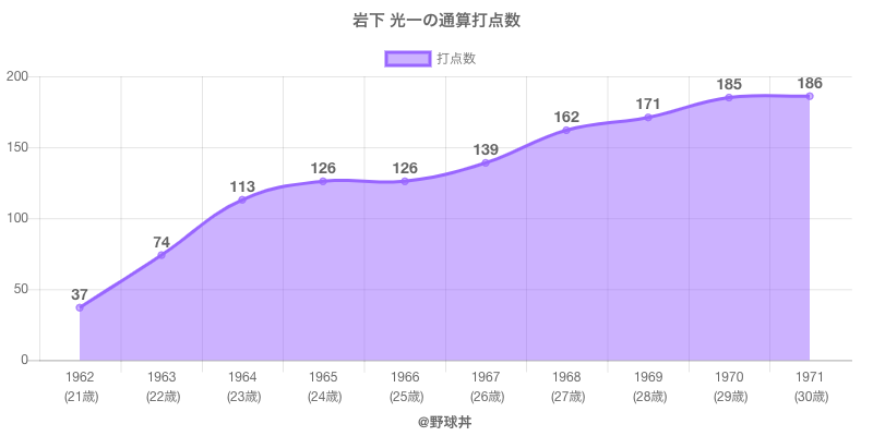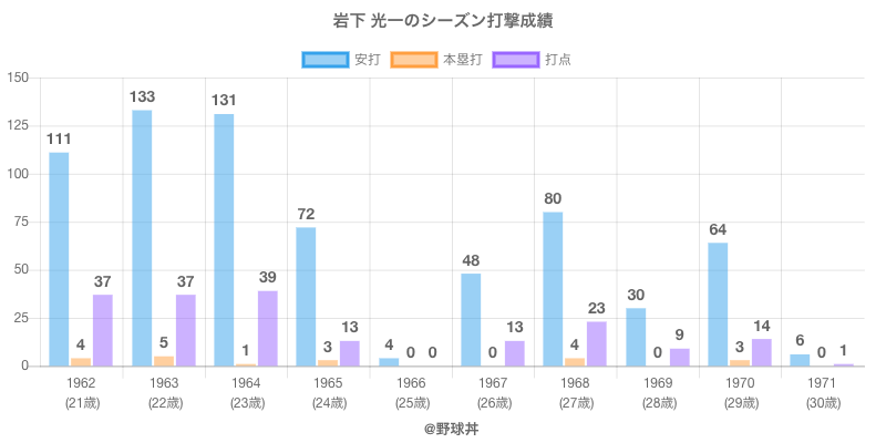 岩下 光一 (85歳)は1962年から1971年にかけて活躍した元東映所属のプロ野球選手です。 投打は右投右打で、守備位置は主に内野手ができ、日本球界初出場は1962年で当時22歳でした。 同年代には尾崎(元大洋)高松(元大洋)がいます。 過去には1963年東映で全147試合出場ヒット133本や1962年東映で全128試合出場ヒット111本という結果を残しています。