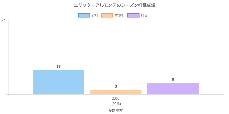 エリック・アルモンテ (47歳)は2005年から2005年にかけて活躍した元北海道日本ハム所属のプロ野球選手です。 投打は右投右打で、守備位置は主にができ、日本球界初出場は2005年で当時27歳でした。 同年代にはジョッシュ(元オリックス)三浦(元埼玉西武)がいます。 過去には2005年北海道日本ハムで全34試合出場ヒット17本という結果を残しています。