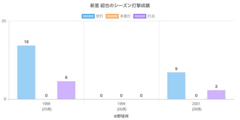 新里 紹也 (53歳)は1998年から2001年にかけて活躍した元大阪近鉄や福岡ダイエー所属のプロ野球選手です。 投打は右投右打で、守備位置は主にができ、日本球界初出場は1998年で当時26歳でした。 同年代には長見(元横浜)遠藤(元東京ヤクルト)がいます。 過去には1998年福岡ダイエーで全68試合出場ヒット18本や2001年大阪近鉄で全23試合出場ヒット9本という結果を残しています。