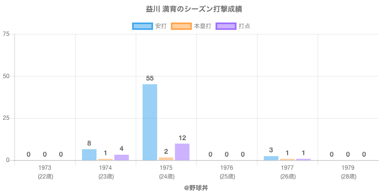 益川 満育 (75歳)は1973年から1979年にかけて活躍した元近鉄やヤクルト所属のプロ野球選手です。 投打は右投右打で、守備位置は主に内野手ができ、日本球界初出場は1973年で当時23歳でした。 同年代には井上(元大洋)東尾(元西武)がいます。 過去には1975年ヤクルトで全79試合出場ヒット55本や1974年ヤクルトで全21試合出場ヒット8本という結果を残しています。