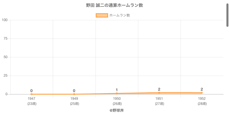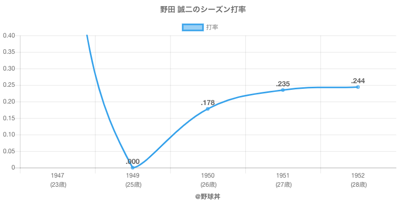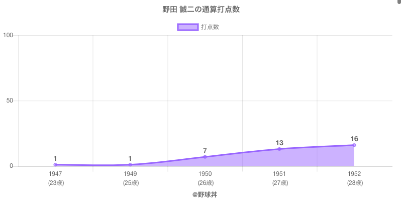 野田 誠二は1947年から1952年にかけて活躍した元大映や広島所属のプロ野球選手です。 投打は左投左打で、守備位置は主にができ、日本球界初出場は1947年で当時24歳でした。 同年代には小林(元大洋)小島(元阪神)がいます。 過去には1952年広島で全51試合出場ヒット20本や1951年大映で全39試合出場ヒット20本という結果を残しています。