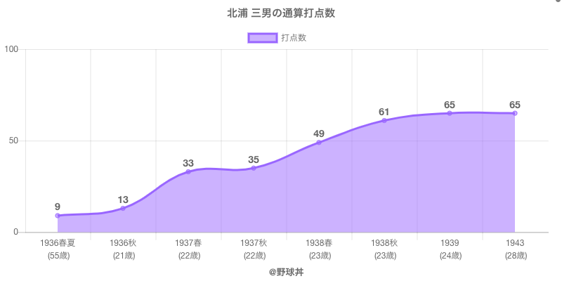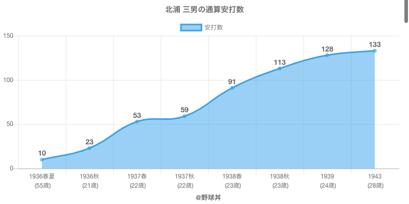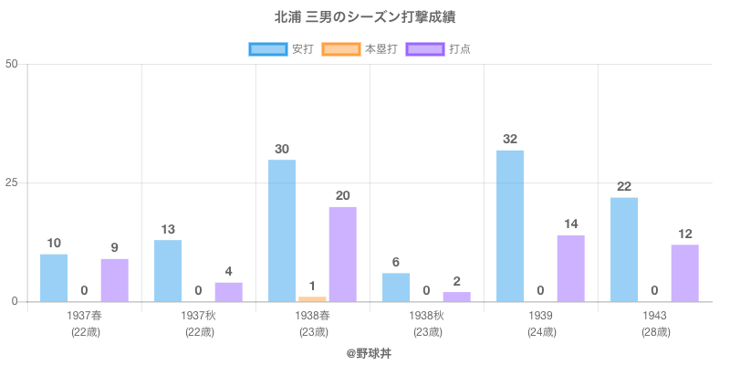 | 1937春 | 43 | 124 | .242 | 30 | 1 | 20 | |