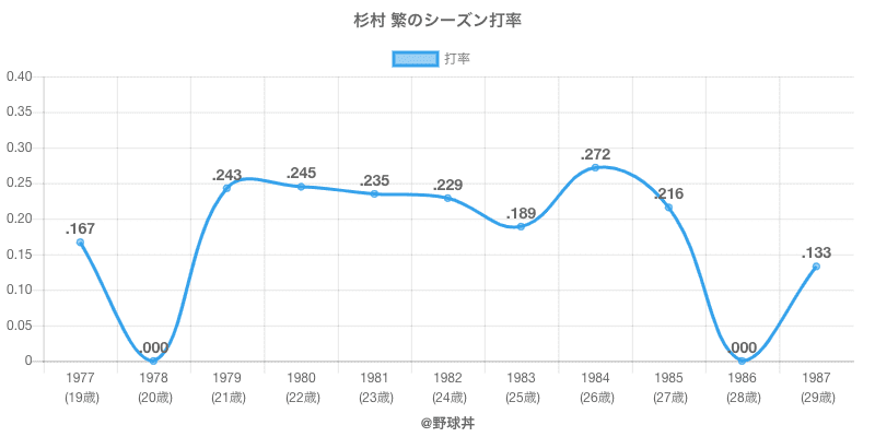 杉村 繁 (68歳)は1977年から1987年にかけて活躍した元ヤクルト所属のプロ野球選手です。 投打は右投右打で、守備位置は主に内野手ができ、日本球界初出場は1977年で当時20歳でした。 同年代には谷崎(元近鉄)鈴木(元日本ハム)がいます。 過去には1982年ヤクルトで全87試合出場ヒット25本や1979年ヤクルトで全77試合出場ヒット45本という結果を残しています。