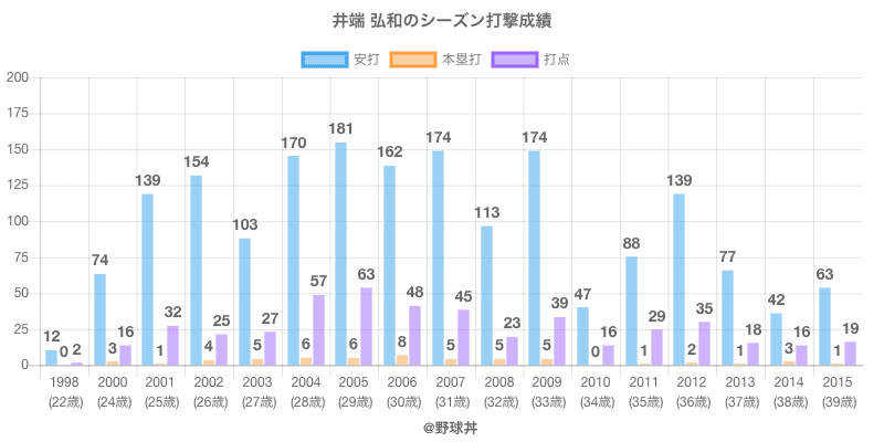 井端 弘和 (50歳)は1998年から2015年にかけて活躍した元読売や中日所属のプロ野球選手です。 投打は右投右打で、守備位置は主にができ、日本球界初出場は1998年で当時23歳でした。 同年代には高見澤(元オリックス)や高橋(元横浜DeNA)がいます。 過去には2005年中日で全146試合出場ヒット181本や2006年中日で全146試合出場ヒット162本という結果を残しています。