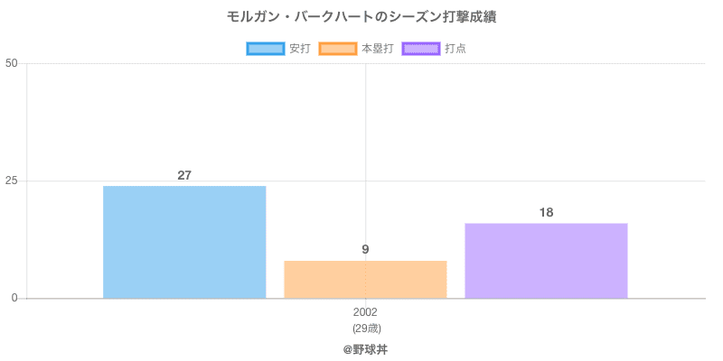 モルガン・バークハート (53歳)は2002年から2002年にかけて活躍した元福岡ダイエー所属のプロ野球選手です。 投打は左投両打で、守備位置は主にができ、日本球界初出場は2002年で当時30歳でした。 同年代にはシャノン(元日本ハム)金森(元中日)がいます。 過去には2002年福岡ダイエーで全42試合出場ヒット27本という結果を残しています。
