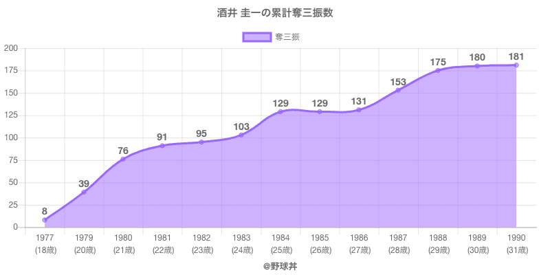 酒井 圭一 (67歳)は1977年から1990年にかけて活躍した元ヤクルト所属のプロ野球選手です。 投打は右投右打で、守備位置は主に投手、日本球界初出場は1977年で当時19歳でした。 同年代には高元(元中日)大石(元近鉄)がいます。 過去には1984年ヤクルトで全42試合出場26奪三振や1988年ヤクルトで全34試合出場22奪三振という結果を残しています。