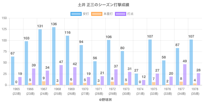 | 1967 | 読売ジャイアンツ | 10位 | .289 | 131 | 9 | 34 |