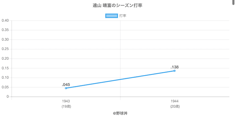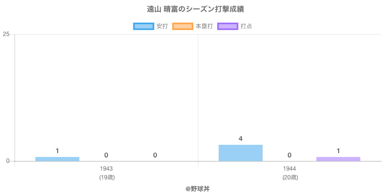 遠山 晴富は1943年から1944年にかけて活躍した元阪急所属のプロ野球選手です。 投打は右投右打で、守備位置は主にができ、日本球界初出場は1943年で当時19歳でした。 同年代には浅井(元毎日)河(元阪神)がいます。 過去には1944年阪急で全15試合出場ヒット4本や1943年阪急で全10試合出場ヒット1本という結果を残しています。