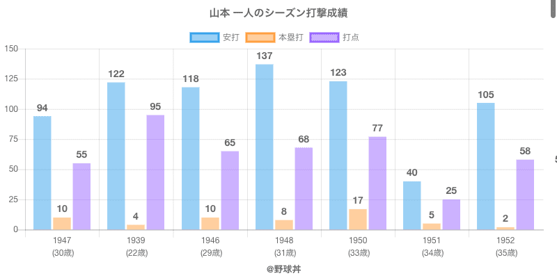 山本 一人は1939年から1952年にかけて活躍した元グレートリングや南海所属のプロ野球選手です。 投打は右投右打で、守備位置は主に投手、日本球界初出場は1939年で当時23歳でした。 同年代には三浦(元名古屋)中村(元西鉄)がいます。 また5度主要タイトルを獲得しています。(最優秀選手3回 / 最多本塁打1回 / 最多打点1回)