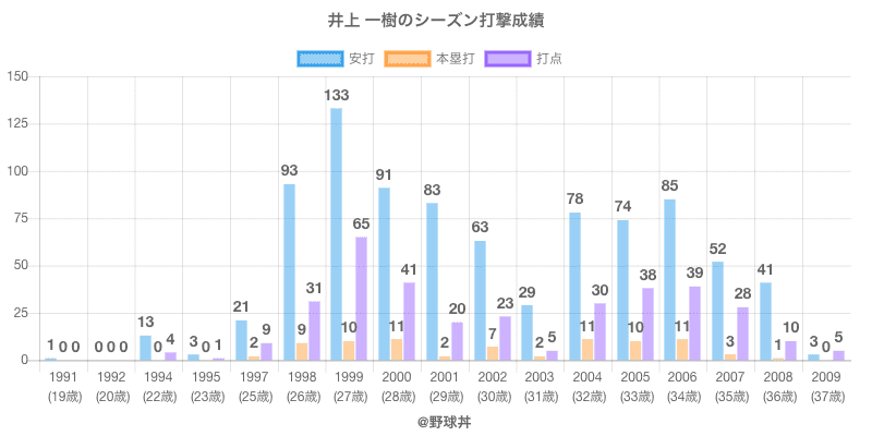 井上 一樹 (54歳)は1991年から2009年にかけて活躍した元中日所属のプロ野球選手です。 投打は左投左打で、守備位置は主に外野手・投手ができ、日本球界初出場は1991年で当時20歳でした。 同年代には仁平(元中日)ジェームス(元オリックス)がいます。 過去には1991年中日で全8試合出場11奪三振という結果を残しています。
