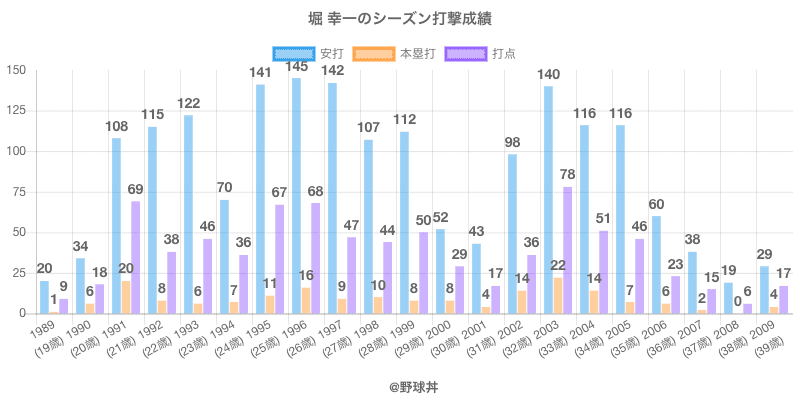 堀 幸一 (56歳)は1989年から2009年にかけて活躍した元ロッテや千葉ロッテ所属のプロ野球選手です。 投打は右投右打で、守備位置は主に内野手・外野手ができ、日本球界初出場は1989年で当時20歳でした。 同年代にはアラン(元広島東洋)やタイロン(元中日)がいます。 過去には1997年千葉ロッテで全131試合出場ヒット142本や2003年千葉ロッテで全130試合出場ヒット140本という結果を残しています。