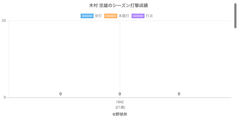 木村 忠雄は1942年から1942年にかけて活躍した元南海所属のプロ野球選手です。 投打は右投右打で、守備位置は主に投手、日本球界初出場は1942年で当時21歳でした。 同年代には松本(元阪急)柴田(元東急)がいます。