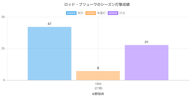 ロッド・ブリューワ (59歳)は1994年から1994年にかけて活躍した元西武所属のプロ野球選手です。 投打は左投左打で、守備位置は主にができ、日本球界初出場は1994年で当時28歳でした。 同年代には原田(元読売)松浦(元横浜)がいます。 過去には1994年西武で全74試合出場31打点という結果を残しています。