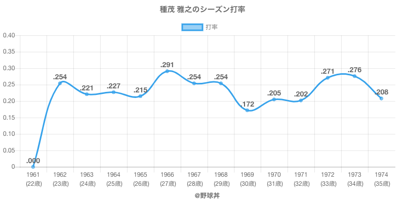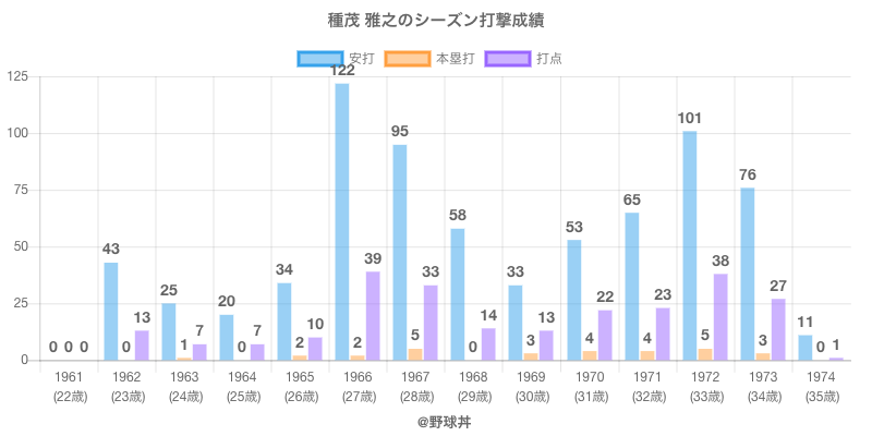 種茂 雅之 (87歳)は1961年から1974年にかけて活躍した元阪急や東映所属のプロ野球選手です。 投打は右投右打で、守備位置は主に捕手ができ、日本球界初出場は1961年で当時23歳でした。 同年代には上土井(元広島)白野(元国鉄)がいます。 過去には1966年東映で全132試合出場ヒット122本や1971年東映で全121試合出場ヒット65本という結果を残しています。