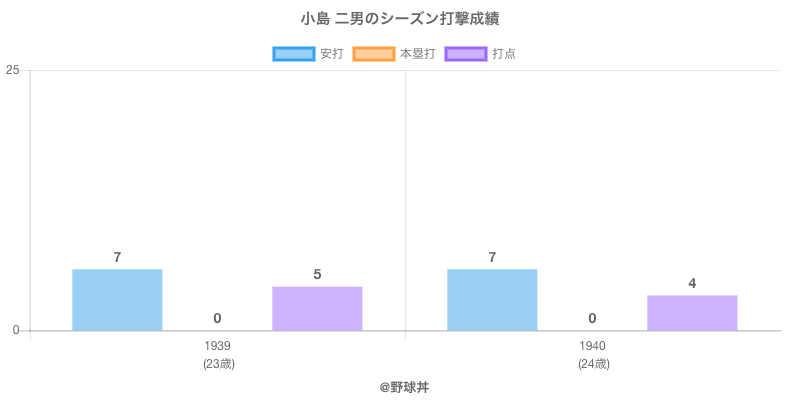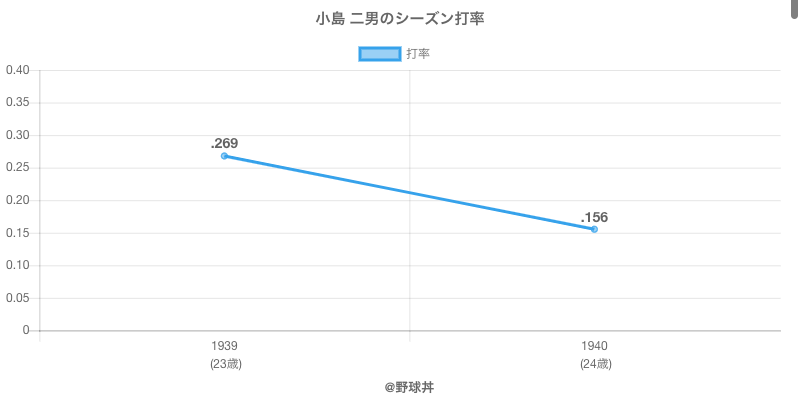 こじま おとお 小島 二男 小島 二男は1939年から1940年にかけて活躍した元セネタースや翼所属のプロ野球選手です。 投打は右投右打で、守備位置は主にができ、日本球界初出場は1939年で当時24歳でした。 同年代には浜崎(元中日)や徳島(元南海)がいます。 過去には1940年翼で全34試合出場ヒット7本や1939年セネタースで全21試合出場ヒット7本という結果を残しています。