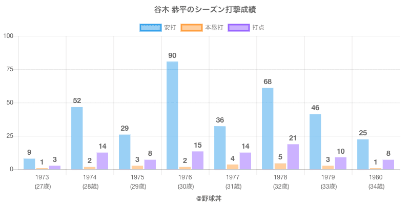谷木 恭平 (80歳)は1973年から1980年にかけて活躍した元中日所属のプロ野球選手です。 投打は左投左打で、守備位置は主に外野手ができ、日本球界初出場は1973年で当時28歳でした。 同年代には雨宮(元近鉄)正垣(元広島東洋)がいます。 過去には1977年中日で全117試合出場ヒット36本や1976年中日で全116試合出場ヒット90本という結果を残しています。