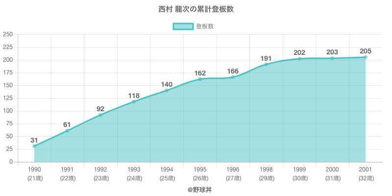 西村 龍次 (57歳)は1990年から2001年にかけて活躍した元福岡ダイエーやヤクルト所属のプロ野球選手です。 投打は右投右打で、守備位置は主に投手、日本球界初出場は1990年で当時22歳でした。 同年代には佐野(元オリックス)や長谷部(元中日)がいます。 過去には1990年ヤクルトで全31試合出場132奪三振や1992年ヤクルトで全31試合出場124奪三振という結果を残しています。