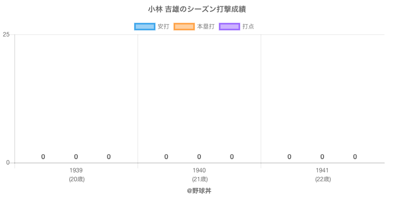 小林 吉雄は1939年から1941年にかけて活躍した元タイガースや阪神所属のプロ野球選手です。 投打は右投右打で、守備位置は主にができ、日本球界初出場は1939年で当時20歳でした。 同年代には中尾(元読売)皆川(元東急)がいます。