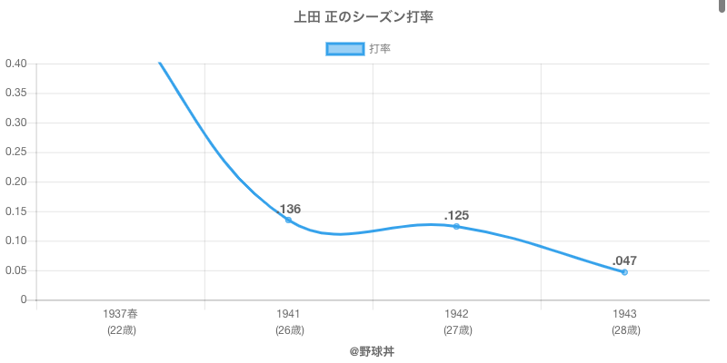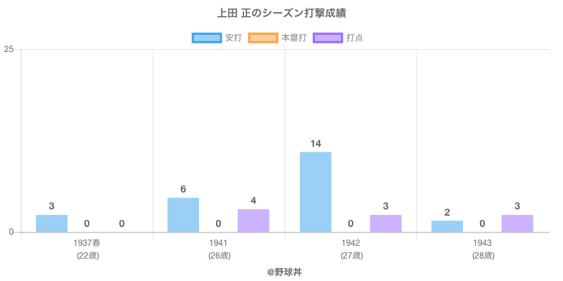 上田 正は1937春年から1943年にかけて活躍した元タイガースや阪神所属のプロ野球選手です。 投打は右投右打で、守備位置は主にができ、日本球界初出場は1937春年で当時23歳でした。 同年代には石丸(元松竹)高須(元パシフィック)がいます。 過去には1942年阪神で全63試合出場ヒット14本や1943年阪神で全28試合出場ヒット2本という結果を残しています。