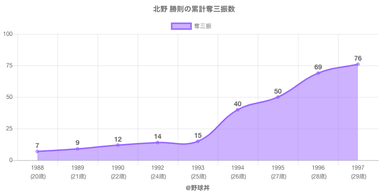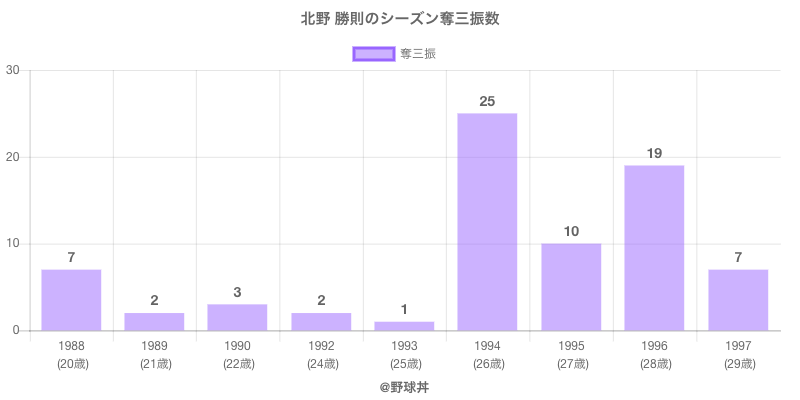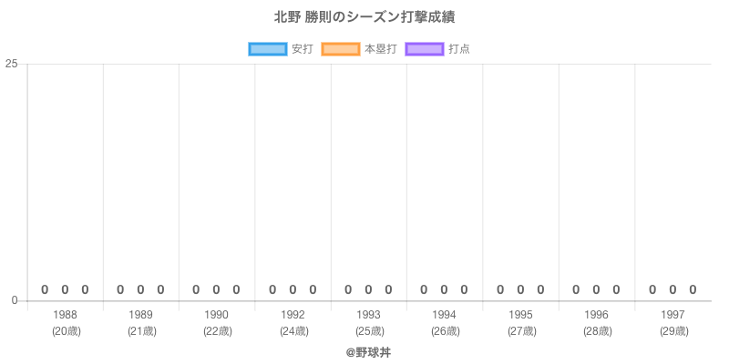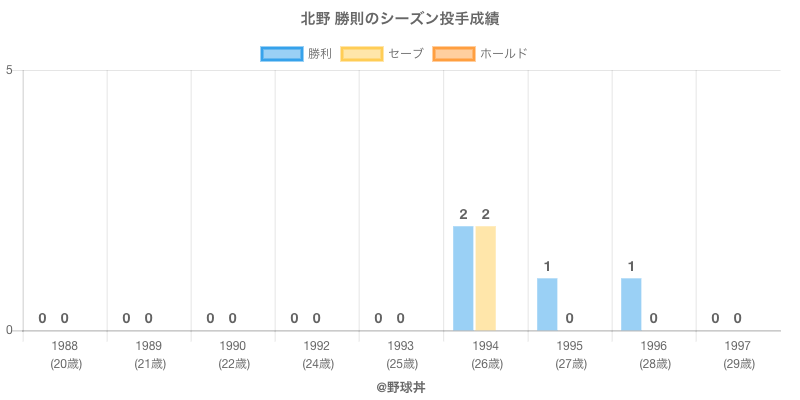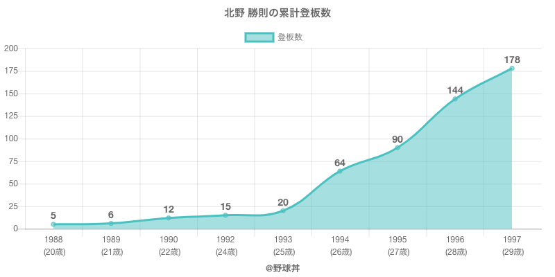 北野 勝則 (58歳)は1988年から1997年にかけて活躍した元中日や横浜大洋所属のプロ野球選手です。 投打は左投左打で、守備位置は主に投手、日本球界初出場は1988年で当時21歳でした。 同年代にはデニー(元中日)や福澤(元千葉ロッテ)がいます。 過去には1996年中日で全54試合出場防御率2.36や1994年中日で全44試合出場防御率2.28という結果を残しています。