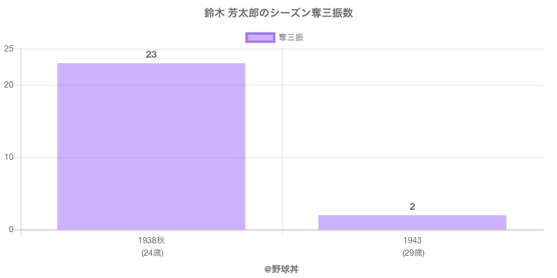 鈴木 芳太郎は1938秋年から1943年にかけて活躍した元南海所属のプロ野球選手です。 投打は右投右打で、守備位置は主に投手、日本球界初出場は1938秋年で当時25歳でした。 同年代には浅岡(元大洋)村上(元朝日)がいます。 過去には1938秋年南海で全11試合出場23奪三振という結果を残しています。