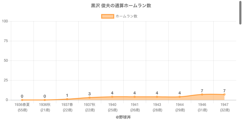 黒沢 俊夫は1936春夏年から1947年にかけて活躍した元大洋や読売所属のプロ野球選手です。 投打は左投左打で、守備位置は主にができ、日本球界初出場は1936春夏年で当時22歳でした。 同年代には杉浦(元国鉄)浅井(元金鯱)がいます。 過去には1946年巨人で全105試合出場ヒット121本や1943年西鉄で全84試合出場ヒット58本という結果を残しています。