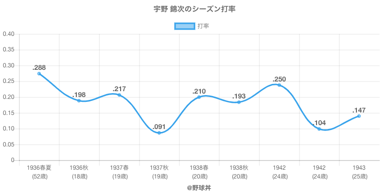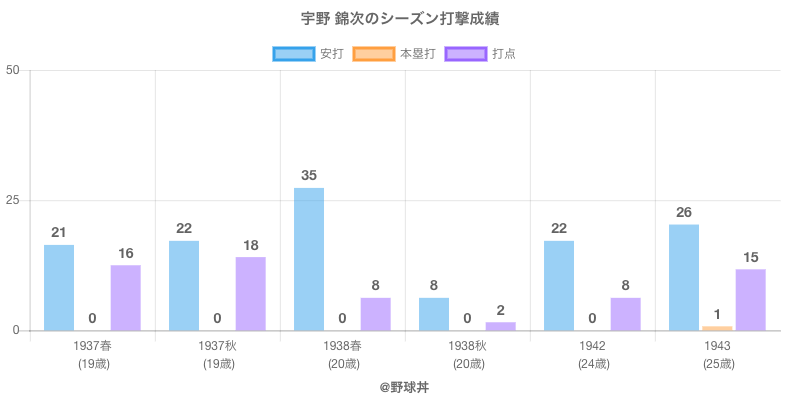 | 1938春 | 33 | 105 | .210 | 22 | 0 | 8 | |