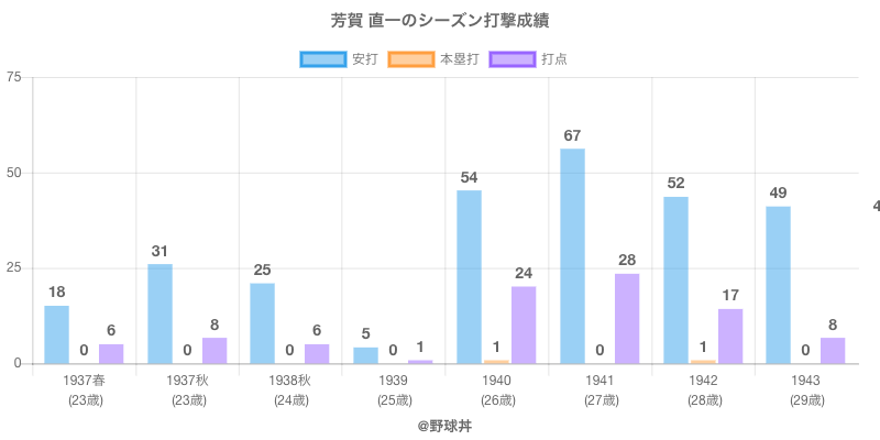 芳賀 直一は1936秋年から1943年にかけて活躍した元名古屋所属のプロ野球選手です。 投打は右投右打で、守備位置は主にができ、日本球界初出場は1936秋年で当時23歳でした。 同年代には芳賀(元名古屋)石井(元イーグルス)がいます。 過去には1940年名古屋で全102試合出場ヒット67本や1942年名古屋で全98試合出場ヒット49本という結果を残しています。