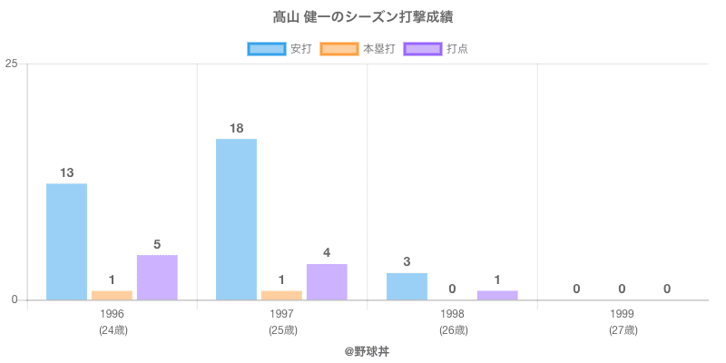髙山 健一 (54歳)は1996年から1999年にかけて活躍した元西武や広島東洋所属のプロ野球選手です。 投打は右投右打で、守備位置は主にができ、日本球界初出場は1996年で当時25歳でした。 同年代には川﨑(元オリックス)やアダム(元福岡ソフトバンク)がいます。 過去には1996年広島東洋で全33試合出場ヒット13本や1997年広島東洋で全33試合出場ヒット18本という結果を残しています。