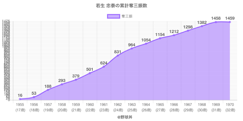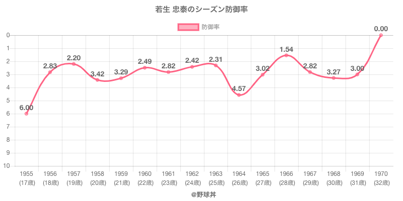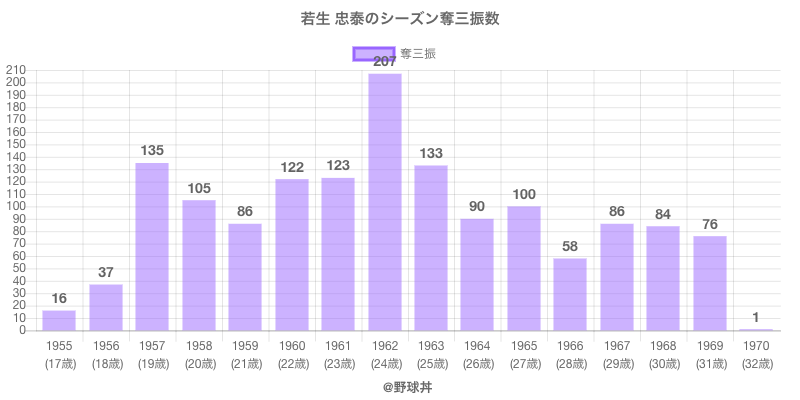 若生 忠泰 (88歳)は1955年から1970年にかけて活躍した元読売や西鉄所属のプロ野球選手です。 投打は右投右打で、守備位置は主に投手、日本球界初出場は1955年で当時18歳でした。 同年代には後藤(元東映)牧野(元近鉄)がいます。 過去には1962年西鉄で全56試合出場防御率2.42や1963年西鉄で全51試合出場防御率2.31という結果を残しています。