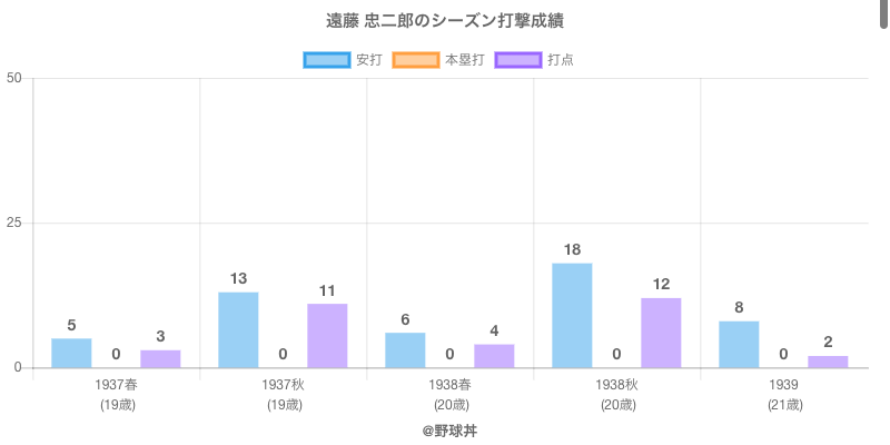 | 1937秋 | 37 | 88 | .205 | 18 | 0 | 12 | |