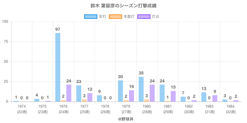 鈴木 葉留彦 (74歳)は1974年から1984年にかけて活躍した元西武やクラウン所属のプロ野球選手です。 投打は左投左打で、守備位置は主に一塁手・外野手ができ、日本球界初出場は1974年で当時23歳でした。 同年代には八重沢(元日本ハム)瓜生(元東映)がいます。 過去には1976年太平洋で全99試合出場ヒット97本や1977年クラウンで全97試合出場ヒット23本という結果を残しています。