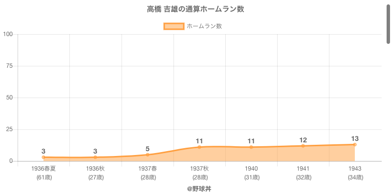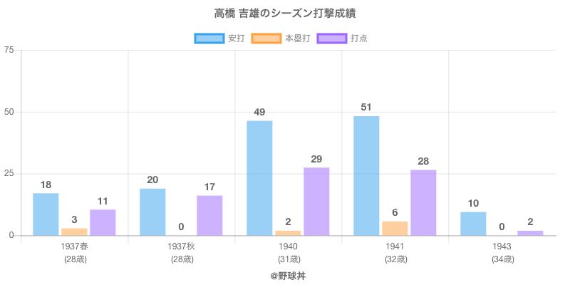 高橋 吉雄は1936春夏年から1943年にかけて活躍した元黒鷲や名古屋所属のプロ野球選手です。 投打は右投右打で、守備位置は主にができ、日本球界初出場は1936春夏年で当時28歳でした。 同年代には水原(元読売)杉田屋(元黒鷲)がいます。 過去には1937春年イーグルスで全55試合出場29打点や1943年大和で全54試合出場ヒット35本という結果を残しています。 また1度主要タイトルを獲得しています。(最多本塁打1回)